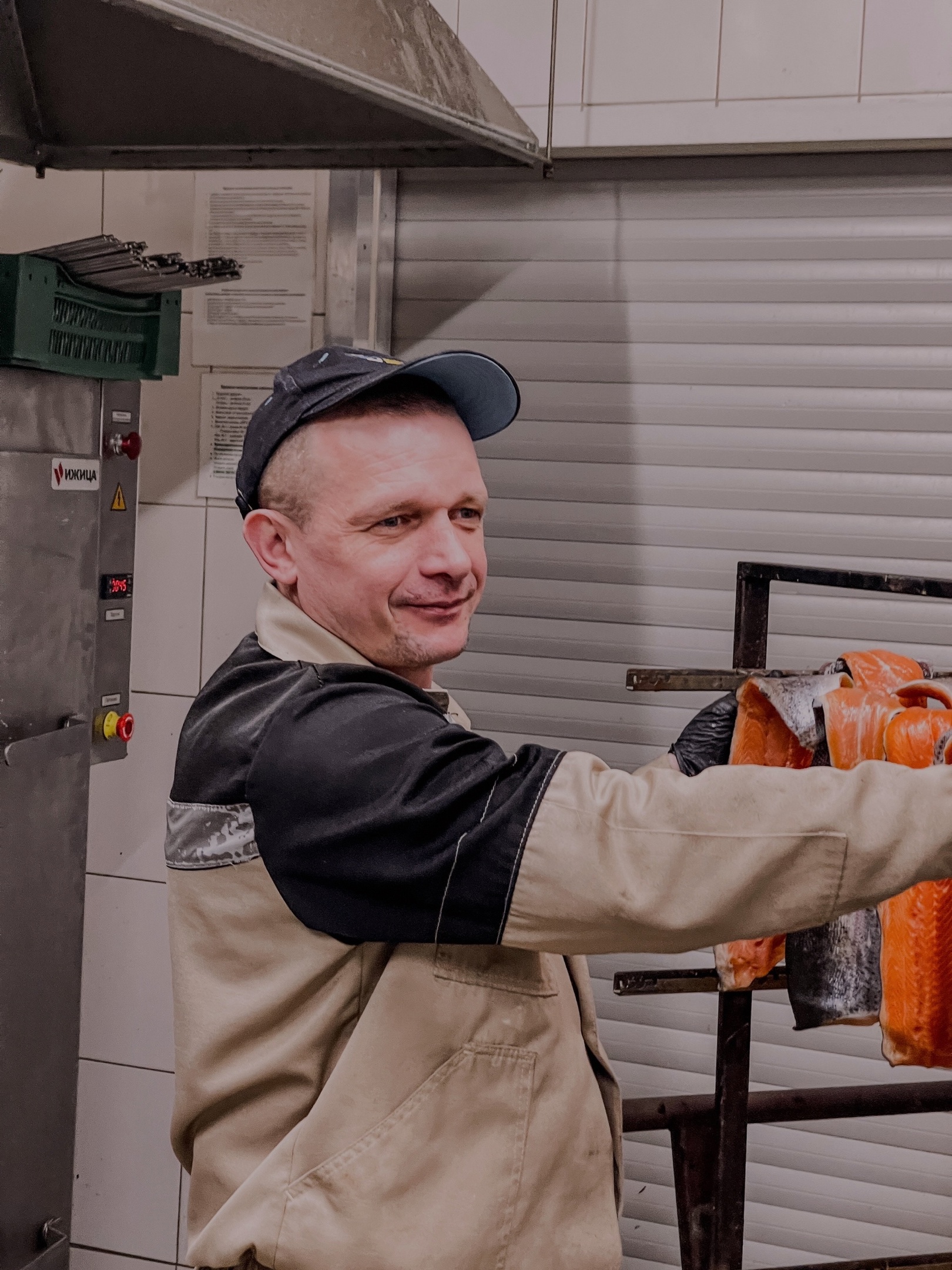 «Много доброго можно сделать, если у тебя хорошее настроение» — © Юрий Никулин. Оптимизм и доброе расположение духа — верные спутники Сергея Каминского, нашего главного коптильщика, даже если нужно выйти в цех на отгрузку в четыре утра. За полтора года в «Приладожье» стал настоящим профессионалом своего дела — от его умелых, точных действий напрямую зависит вкус самых главных наших бестселлеров. Ответственный, добросовестный, безотказный всегда спешит на помощь, если нужны надёжные, сильные руки — в цех переработки сырья и посола. Общительный, остроумный всё время на позитивной волне.