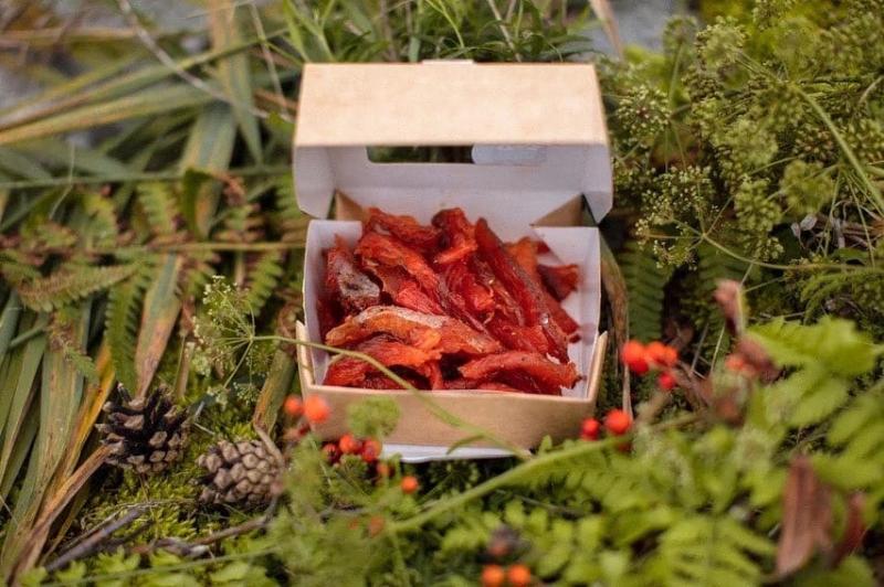 Целую неделю здесь кипит сложный производственный процесс, чтобы форель из садка стала аппетитной янтарной закуской с привкусом моря и костра: вручную разделываем рыбу на филе, тщательно удаляем кости, нарезаем на брусочки одинакового размера, солим, сушим, вялим на ольховой стружке, приправляем специями и травами.