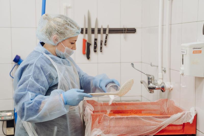 Зрелые ястыки, полученные при разделке рыбы, мы промываем в подсоленной воде, вручную «пробиваем» их через грохотку (мелкоячеистую сетку). Выдерживаем в тузлуке, откидываем на покрытые марлей контейнеры, даём стечь лишней жидкости. На «инспекционном» столе ещё раз тщательно просматриваем икру, убираем остатки плёнок и «лопанцы». Фасуем, охлаждаем и подвергаем шоковой заморозке в специальной камере при -30°С, чтобы сохранить вкусовые и полезные свойства.