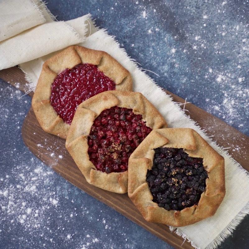 - галеты с брусникой/малиной/черникой/клубникой — мы адаптировали традиционный рецепт карельских сканцев (лепёшек), заменив ржаную муку на цельнозерновую с акцентом на полезные натуральные начинки без сахара