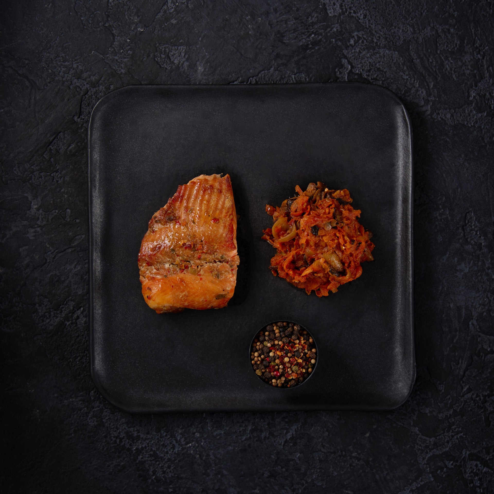 Охлаждённое филе форели доводим до золотистости на сковороде. Отдельно томим овощи с шампиньонами и томатной пастой со специями. Заливаем рыбу маринадом. Подвергаем шоковой заморозке. Отправляем вам. Остаётся лишь разогреть!