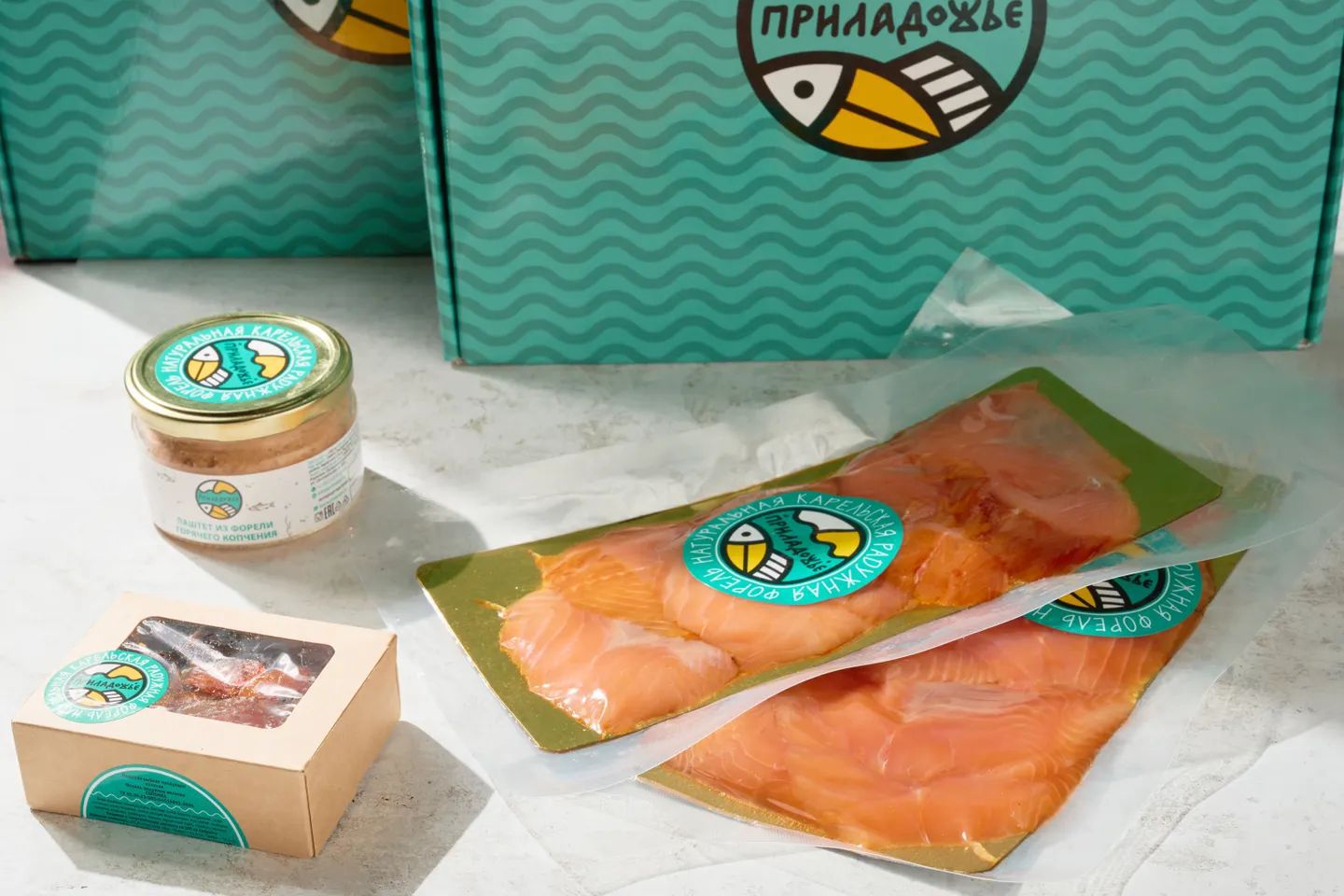 Паштет из форели горячего копчения, 200 г, ломтики форели слабой соли в вакуумной упаковке, 200 г, ломтики форели холодного копчения в вакуумной упаковке, 200 г, вяленая соломка в крафтовой коробочке, 100 г |