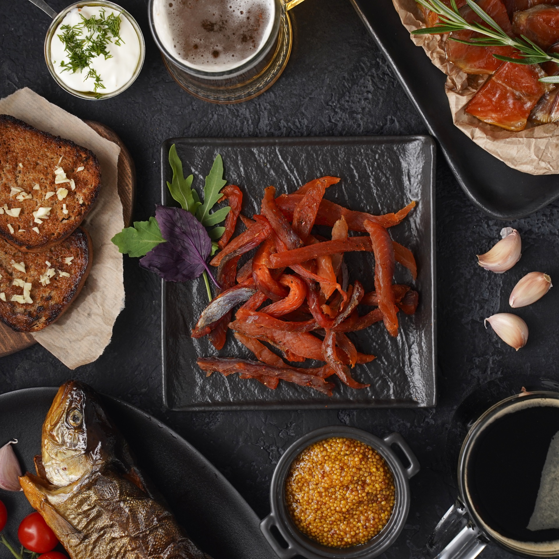 Сами не ожидали, что вяленая соломка из нашей форели станет вашей «зависимостью». Не перестаём удивляться комплиментам в её адрес, самый оригинальный из которых — сравнение с… хамоном. Чтобы форель из садка стала аппетитной янтарной закуской с привкусом моря и костра, на нашем заводе кипит сложный производственный процесс: вручную разделываем рыбу на филе, тщательно удаляем кости, нарезаем на брусочки одинакового размера, солим, сушим, вялим на ольховой стружке, приправляем специями и травами. Всё время следим, чтобы на каждом этапе поддерживалась нужная влажность, температура и длительность выдержки, особенно в сушильных шкафах — это очень важно для правильного «созревания» мяса, ферментации, текстуры, консистенции и вкуса. Готовая соломка получается одновременно тягучей, в меру упругой и при этом мягкой. Удобна как снэк, хороша в салатах, супах и закусках.