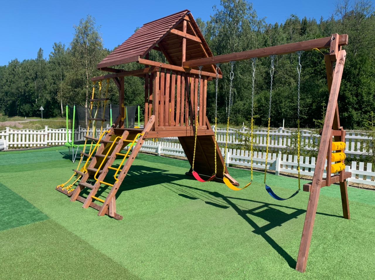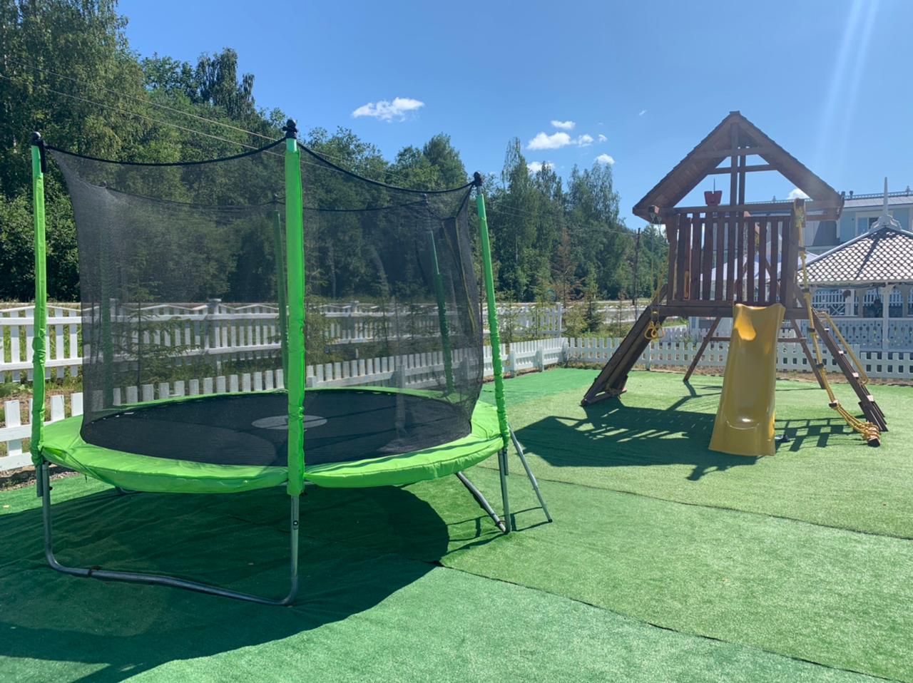 ⦾ две детские площадки с батутами, скалодромом, горками и качелями